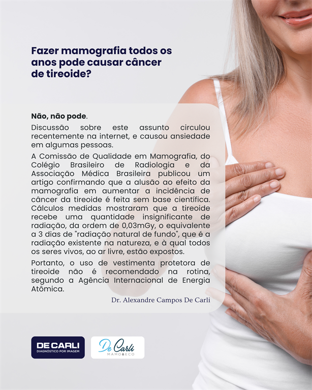 A mamografia anual, quando indicada, não causa câncer de tireoide. A quantidade de radiação utilizada no exame é baixa, controlada e segura, e os benefícios do diagnóstico precoce superam amplamente qualquer risco.